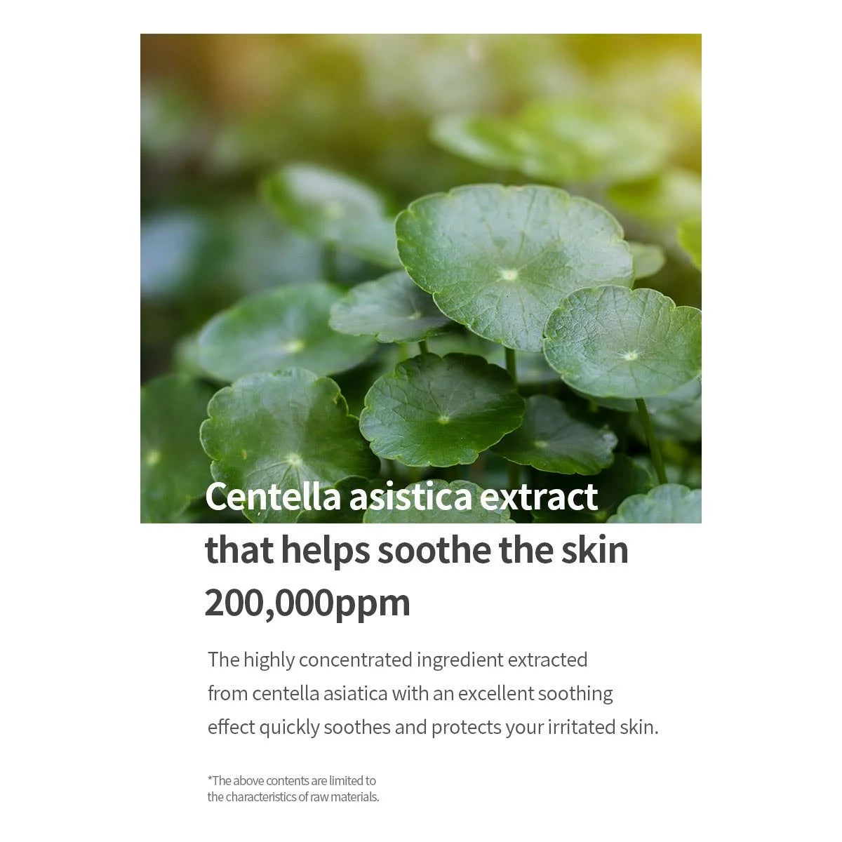 • CENTELLA ASIATICA EXTRACT -  Contains 200,000ppm of Centella Asiatica (Cica) Extract, individually grown from mixsoon’s farm in Jeju Island, Korea.